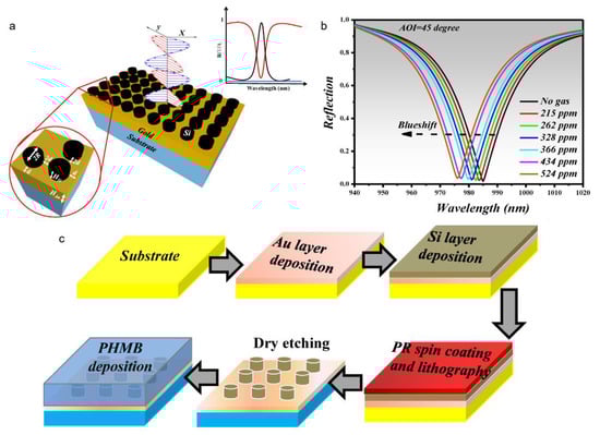 Global warming is increasing at an alarming rate, and the primary antagonist that is responsible is CO2 [94,95]. Additionally, the CO2 flow control needs to be maintained in health science and industry operations. According to a probability analysis, the long-term limit for CO2 lies within 300–500 ppm for 25 percent risk tolerance [96]. Therefore, novel gas sensors must be designed to detect CO2 levels in this range and beyond. Toward this end, a MS-based perfect absorber design was reported to detect CO2 at its signature absorption band of 4.26 µm [97]. The sensor was fabricated by depositing a perfect absorber comprised of silicon nano-cylindrical meta-atoms (MAs) on a gold layer [97]. Moreover, a thin layer of polyhexamethylene biguanide (PHMB) polymer was utilised as the CO2 gas absorption layer on top of the MS. The underlying physics is the absorption and desorption of CO2 gas molecules onto the PHMB layer, resulting in a corresponding change in the RI of the polymer layer. Subsequently, there was a blue shift in the resonance wavelength. Figure 7a,b depict the sensor structure and reflection spectra for increasing concentrations of CO2, respectively. It was evident that there was a blue shift in the resonance wavelength with increasing gas concentrations, resulting in a sensitivity of 17.3 pm/ppm. Moreover, the sensor had a wide detection range from 0–524 ppm. Although these results were based on FDTD-based numerical simulation, the authors proposed a fabrication scheme as shown in Figure 7c.