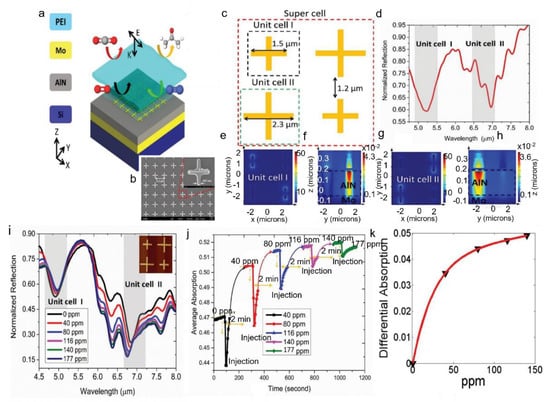 Most of the previously mentioned work for gas sensors did not thoroughly investigate the selectivity, a crucial figure of merit for gas sensors. Considering the limitation above, Hasan et al. reported a hybrid CMOS metamaterial absorber with high selectivity in the mid-IR region [100]. Metamaterial absorber type NDIR sensor converts light to heat energy and can achieve high wavelength selectivity with controlled light-matter interactions. The sensor fabrication started with an 8″ silicon wafer patterned into the metamaterial structure by deep UV photolithography. Afterward, the gas-selective layer was spun coated on the wafer at varying speeds to form different thicknesses. The geometric and chemical composition of the supercell structure is depicted in Figure 8a–c. The simulation results in Figure 8d–h show no near-field interaction among the unit cells. This hybrid metamaterial absorber offered a fast response and minimal hysteresis. Additionally, dual-mode sensing using coupling and non-coupling region of operation provides an efficient technique to use the gas-selective polymer at its fullest potential for both low and high concentrations of CO2 gas. The steady-state response in Figure 8i indicates the maximum signal output of the sensor in response to a particular concentration. The authors suggested that increasing the effective sensing area could increase sensitivity at low concentrations to improve the overall performance. Additionally, sensitivity can be enhanced through engineering the gas-selective layer and controlling the metamaterial and absorber design to ensure better light–matter interactions.