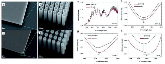 Scanning electron microscope (SEM) images of the fabricated AZO (a,b) nanotube and (c,d) pillar structures with a pitch of 400 nm, the diameter of 300 nm and height of 2 µm. The wall thickness of nanotubes is approximately 20 nm. (e) The response of the AZO nanotubes before and after intercalation of 0.7% H2 gas and upon exposure to (f) 0.7% H2, (g) 2% H2 and (h) 4% H2 gas at the wavelength range of λ = 300–1500 nm [114] © The Royal Society of Chemistry 2020.