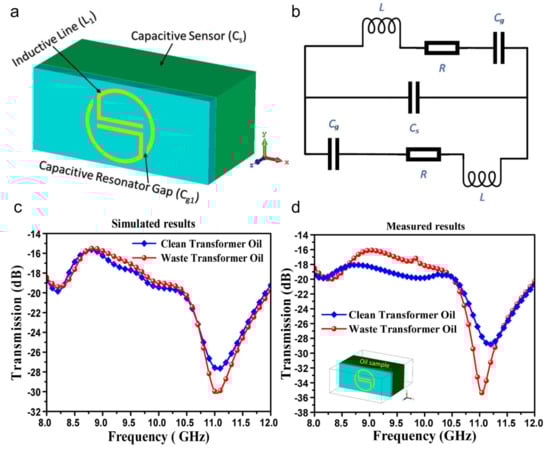 (a) Design of the inductive and capacitive components in the proposed structure. (b) Equivalent circuit diagram of the proposed metamaterial-based sensor. (c) Simulation and (d) experimental transmission spectra in response to clean and waste transformer oils [127] Copyright © 2022 Elsevier BV.