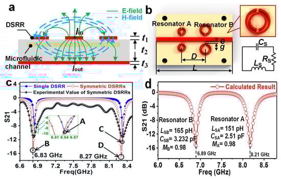 Electrical analysis of the MIM sensor. (a) Cross-section of a microstrip transmission line with a pair of DSRR and its electric field (E-field) and magnetic field (H-field) distribution (Thickness: t1 = 3.5 μm, t2 = 0.609 mm, t3 = 3.5 μm). (b) The equivalent circuit of DSRR. (c) The calculated results from the equivalent circuit of the microfluidic sensor by ADS software. (d) The simulated and experimental S21 spectrum of single or symmetric DSRRs. Points A and B represent resonances excited by single and dual resonator B, respectively. Points C and D represent resonances excited by single and dual resonator A, respectively [133] Copyright © 2018, Nature, Scientific Reports.