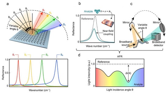 Angle-multiplexed broadband fingerprint retrieval. (a) A germanium-based high-Q all-dielectric metasurface delivers on-demand resonances at a specific resonance frequency n for every incidence angle q with broad spectral coverage. Continuous scanning of the incident angle produces a multitude of resonances over a target fingerprint range, realising an angle-multiplexed configuration ideally suited for surface-enhanced mid-IR molecular absorption spectroscopy. (b) Strong near-field coupling between the dielectric resonators and the molecular vibrations of the analyte induces an apparent attenuation of the resonance lineshape correlated with the vibrational absorption bands. (c) Angle multiplexing combined with the spectral selectivity of high-Q resonances allows for broadband operation and straightforward device implementation. (d) The chemically specific output signal of the device scheme in (c), which is determined by the imaginary part k of the analyte’s complex refractive index n~ (a.u., arbitrary units) [135] Copyright © 2019, Science Advance, Leitis, et al.