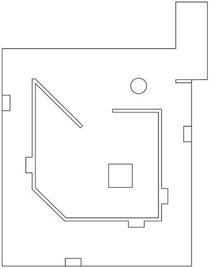 This arena is used for algorithms characterization and calibration, but also for the comparison trials. It is shown in Figure 2. It can be considered as a middle point between Common Environments Arena and Labyrinth Arena, since it has regular figures as Common environments Arena does, but also has long corridors around the zero coordinate of the arena, as Labyrinth Arena does. These are the reasons why it is used for characterization and calibration of the algorithms.