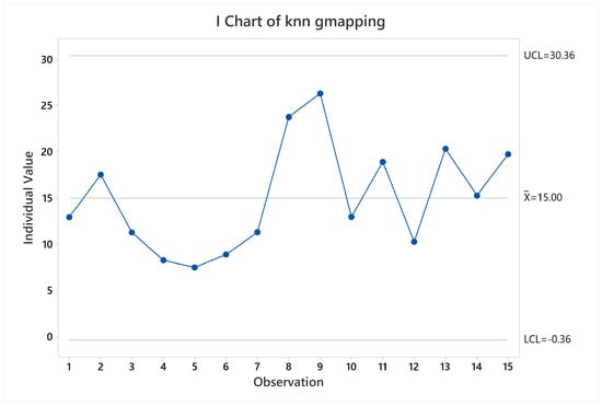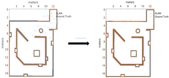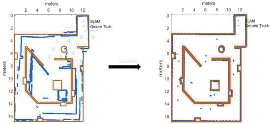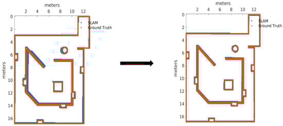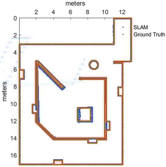 The map accuracy was measured using k-nearest neighbor method [29], by measuring the euclidean distance from each of the ground truth points to the nearest map point generated by the SLAM algorithm under test. A mathematical representation of the metric can be found in Equation (1), where N is the amount of points to sample, and represent the x-coordinate and y-coordinate difference between the ground truth point and the nearest map point generated by the algorithm, respectively. The measurement units used for this metric are centimeters.