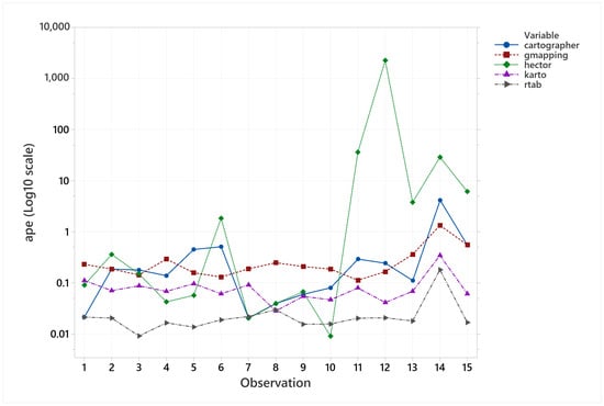 Nevertheless, a different approach can be taken, in order to classify all the algorithms by their means in a range from zero to one hundred, where zero represents the algorithm with the lowest mean, and 100 would be the algorithm with the highest mean. With this classification, KARTO-SLAM comes up as the best choice between all of them, since is the algorithm that shows the lowest average with this methodology. The Equation (6) details this approach, and the results obtained are shown in Table 16.