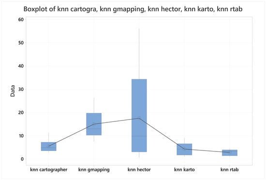 - The proposed methodology is useful to characterize, calibrate, and compare any SLAM algorithm, no matter the robot sensors or SLAM type, as long as the map representation is compatible with the application of the knn-search metric, and the robot pose is obtained in matching measurement units, since the proposed characterization and calibration is based on the final results of the SLAM algorithms, rather than on their internal structure or on the sensors these algorithms use. The method proposed in this paper provides strong statistical evidence, based on the pose error, map accuracy, CPU usage, and memory usage, with descriptive and inferential statistics to bring confidence levels about overall behavior of the algorithms and their comparisons.