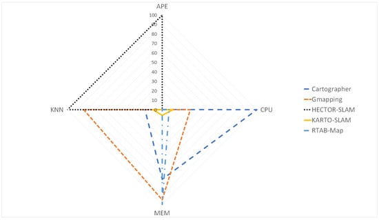 With the Table 15, it can be stated that if map and pose accuracy are priorities, regardless of CPU and memory usage, then RTAB-Map is the preferred algorithm to use. However, if there are limited resources in the mobile robot platform, a better approach could be using HECTOR-SLAM, with the highlight that it is the worse of them regarding map and pose accuracy.