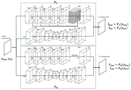 Figure 1 shows a conceptual diagram of the proposed decomposition network. As shown in the figure, the reflectance and illuminance components decoupled from the luminance channel share weights by extracting feature maps that conform to the model by specifying a loss function for each output. In Figure 1, , , and represent the low-light luminance, trained illuminance, and trained reflectance components, respectively. In contrast, , , and represent the paired ground-truth luminance, trained illuminance, and trained reflectance, respectively.