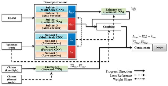 The parallel structure described above becomes structurally flexible by learning the decomposition components, thereby shortening the learning time and clarifying the role of each sub-network. In addition, illuminance enhance-net and chroma-net use a forward CNN to enhance each component because illuminance and chroma include less additive noise than reflectance, such that over-blurring can be avoided.