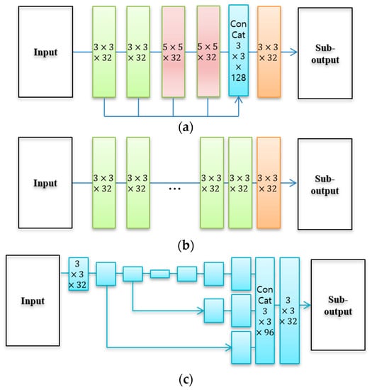 Architectures of sub-network: (a) multi-scale CNN (sub-net 1), (b) forward CNN (sub-net 2), (c) auto-encoder (sub-net 3).