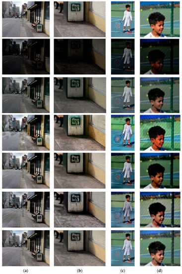 Visual comparisons of with-ground-truth images: (from top to bottom) ground-truth image, degraded image, MSR-net, retinex-net, MBLLEN, KinD, and proposed method. (a) test image1, (b) partially zoomed-in view of (a), (c) test image2, and (d) partially zoomed-in view of (c).