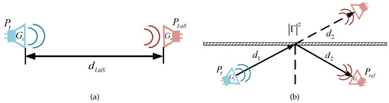 When the electromagnetic wave hits the object at a certain angle, it usually reflects and forms a reflected wave. The ratio of the amplitudes of the reflected wave to the incident one is defined as the reflection coefficient . The received power after reflection can be regarded as the LoS value for the unfolded path length multiplied by , assuming that the size of the reflecting boundary is much larger than distances and , and the surface area is much larger than the illuminated part [34], as shown in (2),