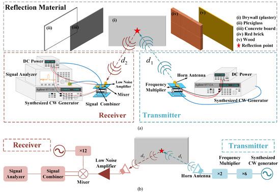 where D represents the horn antenna aperture size [40]. According to (8), the maximum Fraunhofer distance in this system is about 0.27 m, so the distances and are both set as 0.5 m. This distance is a compromise between far-field conditions and illumination of the reflective materials by the antennas [41]. Additionally, (4) indicates that the incident angle has an influence on the reflection coefficient and further affects the received power. Therefore, for the narrowband signals at different frequencies, six angles changing from 20° to 70° are selected as incident angles for measurements, as shown in Figure 4a [40]. Both the angles and distances are measured by a high precision angle ruler in Figure 4b to minimize the calibration error. In fact, different materials have different properties. In order to explore the reflection characteristics of an indoor wireless link in D-band, five kinds of materials, i.e., wood, plexiglass, drywall (plaster), concrete board, and red brick, are selected as the reflection media. The measurement scenarios are shown in Figure 5.