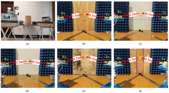 (a) The indoor reflection measurement campaigns in D-band for five materials, (b) Wood, (c) Plexiglass, (d) Drywall (plaster), (e) Concrete board, (f) Red brick.