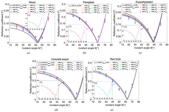 Comparison between measured and Fresnel reflection coefficients for five materials [24,25,26,27,30,31]. (a) Wood, (b) Plexiglass, (c) Drywall (plaster), (d) Concrete board, (e) Red brick.
