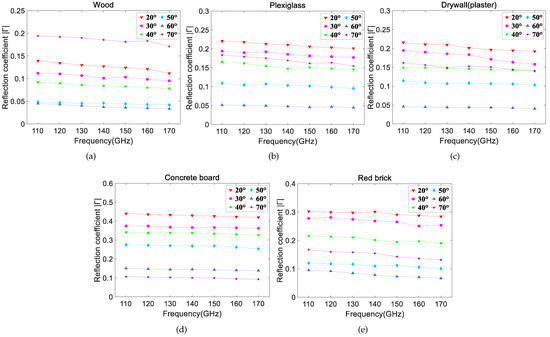 Figure 7a–e shows the relationship between the measured reflection coefficients and the frequencies at different incident angles. It can be seen that the reflection coefficients demonstrate an overall downward trend with slight fluctuations from 110 GHz to 170 GHz at a certain angle, and the trend is flat. This is expected, because with increasing frequency, the Rayleigh roughness factor (described by ) of the material grows and the energy in the specular direction decreases, leading to the reduction in the reflection coefficient [20]. At a certain frequency, the reflection coefficients decrease with the incident angle (i.e., 20°, 30°, 40°, 50°, 60°). Additionally, the measured reflection coefficients are generally small and most of them are less than 0.3, implying a high reflection loss.