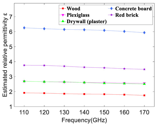 The previous research suggests that the relative permittivity of the samples does not change significantly with the transmission frequency, even over a wide frequency range. It is also found that the dielectric constant is usually related to the variation of sample compositions rather than the frequency [43,44]. Figure 8 demonstrates the estimated relative permittivity of five kinds of materials versus the frequency. It is easy to conclude that the relative permittivity decreases with slight fluctuations from 110 GHz to 170 GHz for a certain material, but the change is quite subtle. For example, the relative permittivity of wood decreases from 1.92 to 1.75 with increasing frequency in D-band and the largest gap is only 0.17, which is less than one-tenth of the relative permittivity. In the same way, the largest gaps are just 0.13, 0.18, 0.32, and 0.27 respectively, corresponding to plexiglass, drywall (plaster), concrete board, and red brick. In addition, the relative permittivity of different materials changes significantly at a certain frequency. The values of concrete board and wood are the largest and smallest, respectively. The results in Figure 8 are consistent with the previous research and further confirm the reliability of our work.