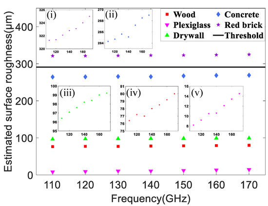 Figure 9 demonstrates the surface roughness of five kinds of materials in the D-band range. The symbols denote the estimated surface roughness by the MMSE criterion and the average of them are 78.0 µm, 11.2 µm, 97.9 µm, 266.7 µm, and 322.8 µm respectively, corresponding to wood, plexiglass, drywall (plaster), concrete board and red brick. It is evident from the insets (i)–(v) of Figure 9 that the surface roughness increases with frequency but the change is small. The reason is that the signal at higher frequency suffers a larger penetration loss. Therefore, the signal distribution will be concentrated on the surface and more scattering will occur, which increases the roughness of surface [31]. The black bold line is set as the threshold (291 µm) to distinguish whether the surface of an object is rough or smooth. It is determined by (5) and [45]. Therefore, the surface of plexiglass is regarded as quite smooth. The wood and drywall (plaster) are considered relatively smooth although they are rougher than the plexiglass. Note that the surface roughness of the concrete board is so close to the threshold that it is classified as rough material like red brick. As can be seen from Table 7, the smooth plexiglass has the lowest MMSE whereas the rough materials concrete and red brick have higher values. Chances are that the MMSE can imply the surface roughness of building materials in our method. Despite the high surface roughness of the concrete board, which means more power loss in the specular direction, its reflection loss is lower than that of the other four kinds of materials shown in Table 6. In fact, based on the analysis of (7) before, it is not surprising that the concrete board has the lowest reflection loss of the five kinds of materials because it has the largest relative permittivity. This suggests that the reflection characteristics of indoor building materials are determined not only by surface roughness, but also by many other factors, such as relative permittivity, frequency, and incident angle.