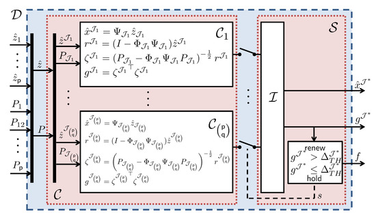 The configuration of the secure state estimator, which replaces the information fusion center in Figure 1, is sketched in Figure 2, and its operation is described in Algorithm 2. Before explaining the operation, let denote where and P are given in (21) and (23), respectively. Furthermore, the notation for a sub-matrix is slightly abused for simplicity. For example, , , and denote