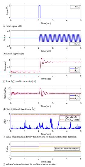 The simulation is performed under 1-sparse sensor attack on the third sensor with the signal shown in Figure 4b, which is made to mimic the motion pattern by the natural frequency as observed in Figure 4c,d. Moreover, the attack starts at 2 second, which is the same time when the square pulse input u is injected into the system as described in Figure 4a. Even under the attack signal, the resilient state estimation with multi-sensor information fusion Kalman filter based on the observability decomposition developed in Section 3 and Section 4 works well. The states are recovered with a small error as demonstrated in Figure 4c,d, which are the state estimation results for and , respectively.