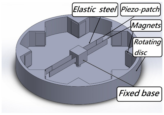 The classical VEH system considers the analysis of vibration, but the power generation effects actually depend on the vibration amplitude and the force on the PZT. Therefore, it is a necessary part of the analysis to accurately excite the system and make it generate larger electric energy. In this study, in addition to the establishment and analysis of the VEH nonlinear theoretical model, the correctness of the theory is verified by experiments. The nonlinear system frequencies are derived by dimensional analysis and used to excite the CVEH system. We use the disk to simulate the situation of the rotating wheel (Figure 1), and attach magnets around the disk, so that the magnetic poles can be exchanged when the disk rotates, and then the magnets on the fixed-free beam with a tip mass will be repulsive, so that this beam can be swung periodically by magnetic force. It is worth noting that the device in Figure 1 can also be reversed, as shown in Figure 2, so that each group of double elastic steel systems is fixed on the outer ring of the disc, and the magnet is placed in the middle of the turntable. When the wheel rotates, the steel sheet will also be affected by the magnet, which will cause the steel sheet to swing and generate electricity. This system can make more groups of PZT generate electricity at the same time, and can also be installed on the transmission shaft of the tail boom of the helicopter. The systems of Figure 1 and Figure 2 are only used to show that the concept of the rotating magnetic field can be applied to these two types of systems. The basic principle they used is to employ a rotating magnetic field to excite two pieces of elastic steel and slap each other to generate more electricity. It is believed that it can produce greater economic benefits in the industry.