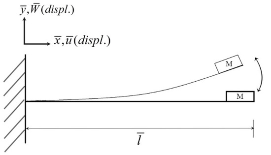 Its coordinates are shown in Figure 4. is the beam mass per unit length, E is Young’s modulus, A denotes the cross-sectional area of the beam, I represents the moment of inertia of the beam, is the slapping external force on the beam, represents the differential with respect to space (), denotes the time differential (), and represent the deformation in the and directions, respectively. The boundary conditions of this elastic beam are: