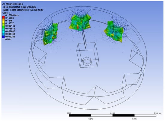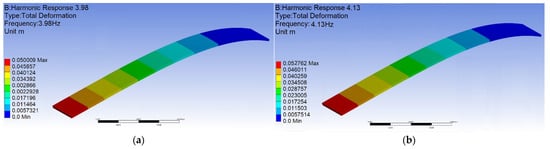 In order to further understand the magnetic field distribution of this device and the mutual repulsive force between the magnets, and to observe the displacement of the elastic steel, to preliminarily estimate the possible deformation of the PZT, we used the commercial software ANSYS to construct this model. We focus on the magnetic field between the magnets at the three key positions on the rim of the wheel and the magnet at the end of the elastic steel. The purpose of the numerical simulation is to analyze the magnetic flux of the elastic steel with lengths of 10 cm, 7.5 cm and 5 cm and the force of the magnets at the end point of the elastic steel. Taking a 10 cm elastic steel sheet as an example, Figure 5 shows the distribution of magnetic flux, and the maximum value can reach 0.173 Wb. Figure 6 shows the force of the magnet at the end of the elastic steel, and the sum is 3.34 N. The simulation results show that the design of this model works. From Equation (55) and converting to the dimension of this system, we used the linear frequency (3.98 Hz) and the nonlinear frequency (4.13 Hz) as the excitation frequency of the external force to analyze the displacement of the elastic steel. Figure 7a,b shows the results for linear frequency and nonlinear frequency excitation, which are 5.00 and 5.27 cm, respectively. Similarly, when the elastic steel sheets of 7.5 cm and 5 cm are excited at these two frequencies, the displacements are 1.99 cm, 2.11 cm (for 7.5 cm steel) and 0.50 cm, and 0.55 cm (for 5 cm steel), respectively. Among them, we found that the steel displacements excited by the nonlinear frequencies are larger, and the longer the elastic steel, the larger its end point displacement. Although a longer elastic steel may theoretically have a larger power generation, the authors’ previous analysis showed that a longer elastic steel cannot have a larger power generation in this clapping VEH system. The reason is that the repulsive force of the magnet and the elastic restoring force of the elastic steel cannot be perfectly matched when the slap force is considered. Therefore, longer elastic steel does not mean better power generation efficiency. These phenomena may not be simulated by a simple FEM model, so we use experiments to analyze their power conversion effects.