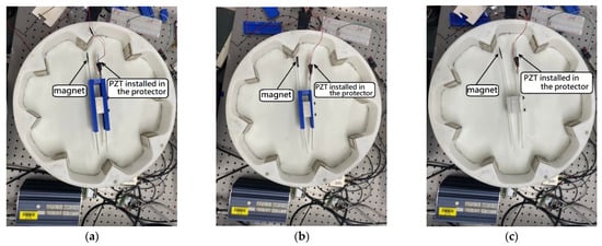 In the experiment of Wang and Chu [11], in order to improve the power generation efficiency, elastic steel with a longer length (10 cm) is used, but when the modes above the 2nd mode are excited, irregular oscillation occurs, resulting in a great decrease in the power generation efficiency. We speculate that the speed of the modes above the second mode may be faster. After the elastic steel that is too long is ejected due to the magnetic force, the elastic restoring force is not enough to pull the elastic steel back, such that the magnetic force and elastic force of the whole system cannot match with each other. This technical note uses experiments to measure the power generation efficiency of another two sets of elastic steel sheets with lengths of 7.5 cm and 5 cm, respectively, to determine the benefit of this CVEH. The combination of the three elastic steels and PZT is shown in Figure 9. In addition, in order to reduce the damage of the slap force on the PZT, we designed a PZT protector to insert into the PZT, as shown in Figure 10. The purpose is to ensure that the slap force can be fixed on a specific position of the piezoelectric patch, and to avoid irregular slap points and slap force, resulting in uneven force on the piezoelectric patch, or affecting the frequency of periodic vibration.