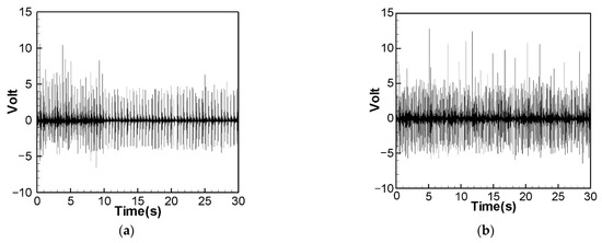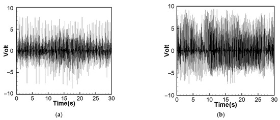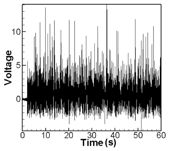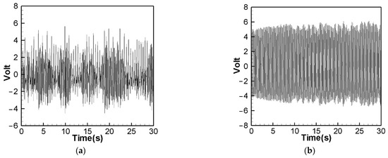 The clap force of the two elastic steel sheets is assumed to be the concentrated force acting on the PZT from the other elastic beam (steel) ( in Figure 3). The dimensionless slapping force is . Combining Equations (8) and (11), the theoretical voltage of each mode can be obtained by the fourth-order Runge–Kutta method. Please refer to Wang and Chu [11] for details.