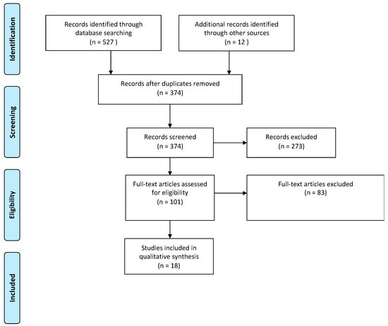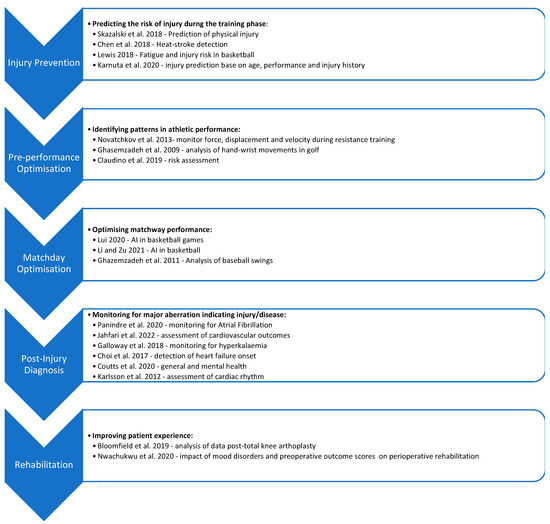 The database search yielded a total of 527 studies. After duplications were removed, titles and abstracts of the remaining 374 studies were assessed for eligibility, and 273 studies were removed. A further 80 studies were excluded after full-text review due to incompatible outcome measures or study design (Figure 1). Of the remaining studies that discussed the use of artificial intelligence in sensors for sports medicine, we classified them according to each phase of an athlete’s journey, which typically consists of pre-event training, in-event performance, injuries during events or training phases, and follow-up if athletes sustain any injuries. Based on this journey, we categorised studies based on their ability to predict the risk of injury during training or events; optimisation of performance; diagnosis of injuries; and management of injuries in the aftermath (Table 1; Figure 2).
