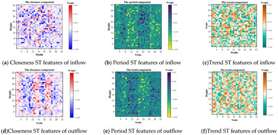 - TaxiBJ dataset is crowd flow data obtained from GPS trajectory data of Beijing cabs, which contains four-time intervals: 1 July 2013, to 30 October 2013; 1 March 2014 to 30 June 2014; 1 March 2015, to 30 June 2015; and 1 November 2015, to 10 April 2016. This dataset firstly divides the main urban area of Beijing into 32 × 32 grid areas, and secondly counts the origin and destination points of each vehicle trajectory in the above four time periods according to the 0.5 h interval. Because the dataset has ST continuity, the dataset can detect all traffic conditions under a specific region;