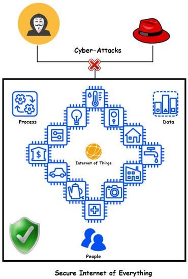 The Internet of Everything (IoE) (shown in Figure 1) is a network of sensor devices that collect and exchange data or information without the need for human engagement [1]. IoE refers to the intelligent interconnection of people, processes, data, and digital objects. In addition, the Internet of Things (IoT) is a network of billions of things and devices that use various wired and wireless network protocols [2] to detect, measure, and analyse their state in public or private networks [3,4]. By the next decade, it is expected that our technological future will be made of a variety of appliances, devices, and beings that are all connected to the Internet [1]. However, if we can determine the true distinction between IoT and IoE, the IoT focuses on physical objects and entities interacting with one another, while the IoE provides the smart network to connect all of these principles into a single system [3,4]. The IoT has been restricted to automating Machine-To-Machine communication or devices [2] whereas, IoE involves Machine-To-Machine (M2M), Person-To-Machine (P2M), and Person-To-Person (P2P) connections [1]. As a result, phones, tablets, and computers as well as data, people, and business processes all contribute to this intelligent ecosystem. The IoE ecosystem can be applied to various use cases, including but not limited to education, transportation [4,5], entertainment, defence [4], smart environments [6], healthcare devices [6], etc., all these becoming heterogeneous smart nodes that communicate with another in the network [3,4].