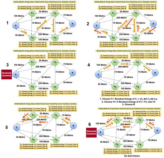 Figure 3. The protocol initially stabilizes the network for proper decision-making in upcoming sessions. (1) Node S chooses the next hop by considering energy status and distance. (2) Packet forwarding and returning of packet along the bi-directional route. (3) S generates incentives for all relay nodes based on obtained from direct and overheard nodes. (4) The node is chosen as the next hop, as its energy residue is more than the peer nodes of S. (5) Optimal route selection to reach node R via . (6) S generates incentives for all the relay nodes after receiving the ACK/NACK packet via the same route. - The incentive procedure performed by node S may happen after certain periodic intervals, though not after every round-trip session cycle in order to reduce the network overhead and save the computing resources. Furthermore, the incentive for the cooperative or non-cooperative relays is communicated through the trusted nodes.