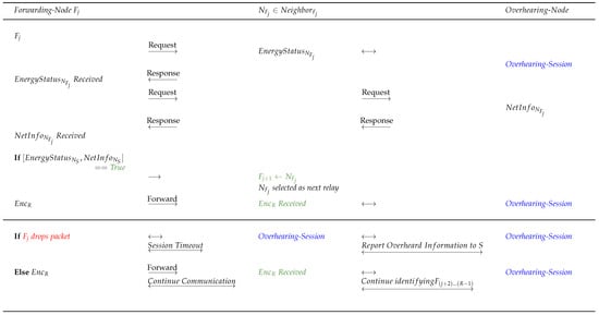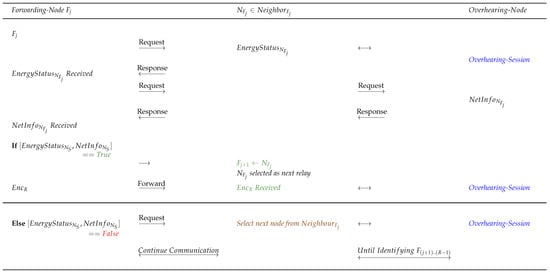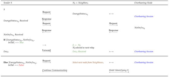 - When the network stabilizes, i.e., if no null entries are found, node S can make a clear judgement as to how to identify the next-hop nodes in subsequent communication cycles by considering the direct energy status, incentive, and overheard (refer to Section 3.3.2) rather than relying on the energy status and distance range. Finally, if there are more packets to send in the upcoming communication cycles, then a new session starts again to transmit a new to node R.This selection and nomination procedure continues until the encrypted text reaches node R, which is elaborated in Algorithm 1.