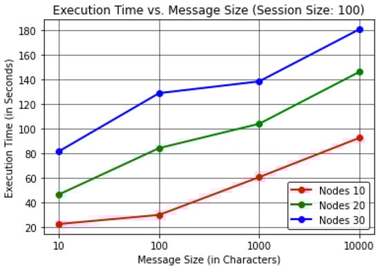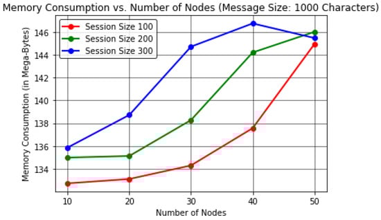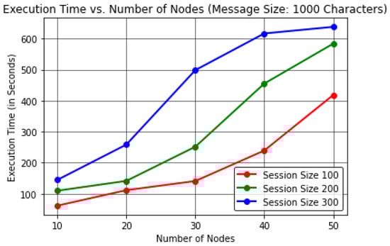 Figure 9. Execution time vs. number of nodes. - In Table 7 and Figure 10, the results reveal that as the forwarding node increases, the memory consumption at each node increases for session size up to 300 to transmit 1000 characters. The protocol shows a maximum memory consumption of ≈145.67 MB for at most 50 forwarding nodes in the network.