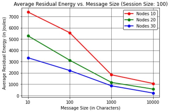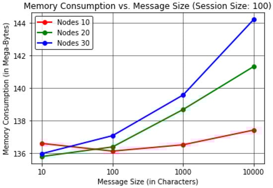 Figure 7. Memory consumption vs. message size. - In Table 5 and Figure 8, the results reveal that as the message size increases the average residual energy needed to execute the protocol decreases when considering up to 30 forwarding nodes. It can be observed that the average residual energy is inversely proportional to the message size, as ≈210.91 J of average residual energy is left among all the forwarding nodes when the message size is 10,000 characters.