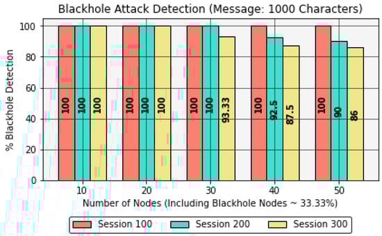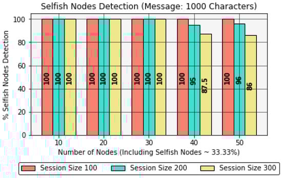 Figure 12. Selfish node detection vs. number of nodes. - In Table 10 and Figure 13, the overall accuracy of the protocol degrades as the session size increases due to the inclusion of blackhole nodes in the network. Moreover, the ratio of dead nodes compared to energy-spoofing nodes increases due to high energy-deriving operations such as new node or path discovery after . The overall reliability of the protocol achieves 100%, 80%, and 70% when considering a session size of 100, 200, and 300, respectively.