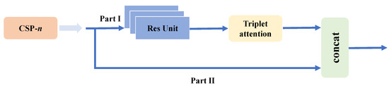 CSPDarknet53 is chosen as the backbone network. The nature of convolution is to make the network pay more attention to the local information, but the global and spatial information are ignored. Therefore, we combined the Triplet attention mechanism in the backbone network to pay more attention to global information. The specific location is shown in Figure 2.
