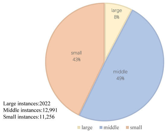 TT100K [30] consists of 100,000 images with resolution, covering most traffic signs, which can provide support for both classification and recognition tasks of traffic signs in real-world scenes. The TT100K dataset contains objects of different sizes, divided into three sizes: small, medium, and large. The resolution of small objects is less than , the resolution of medium objects is between and , and the rest are large objects. The 45 classes and the traffic lights and stop signs in the COCO [31] dataset are used as our dataset, called TT100K-COCO. TT100K-COCO contains a total of 9865 images, of which 8878 are used for the training process. The training set includes 7990 images, the validation set contains 888 images, and 987 images are used as tests. Due to the random division of images, the number of instances of classes varies greatly, which tests the detection ability of the model even more. The composition of the data set was shown in Table 1 and Figure 5.