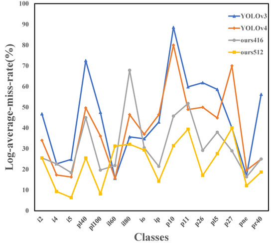 Figure 6 shows the Miss Rate (MR) of each model at 16 different traffic signs. MR is used to indicate the rate of missed detection in the test results, as shown in Equation (9):
