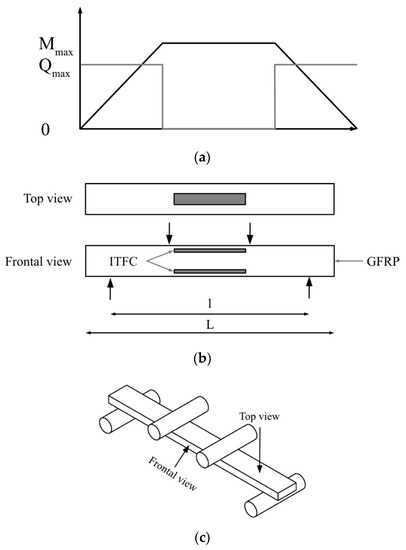 Schematic illustration of the ITFC in the GFRP with lateral force and moments. (a) shear forces and moments in the 4PB sample. (b) The ITFC is in the area with maximum bending moment and no shear forces. A top view of the sample is shown in the middle, while the frontal view of the sample can be seen on the bottom. The ITFC is gray, the GFRP white with a black border. (c) Three-dimensional sketch of the sample in a 4PB setup to show the frontal and top view.