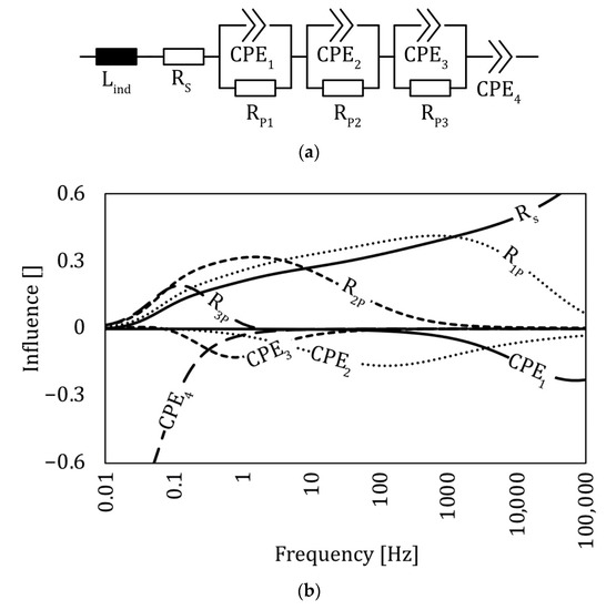 An ECM (Figure 2a) was used to analyze the system in various conditions to see its wide range of applications, which is an indication that the ECM is valid for the used system. Additionally, by varying the operation conditions and the sample properties, the influence of the EIS data in relation to the equivalent circuit elements can be investigated.