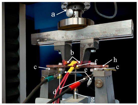 Four-point bending test setup. The GFRP beam (h) with ITFC is shown between the four force entry points (b,c). Four cables (d,e) are connected to the sample for EIS measurement. The power (d) and sense (e) cables are placed separately so as to not interfere with each other. Deformation is detected with a linear position sensor (g), touching the bottom of the sample. Strain is detected with four strain gauges (f) whose cables can be seen running from the middle of the sample to the bottom of the image. Mechanical force is measured via a load cell (a).