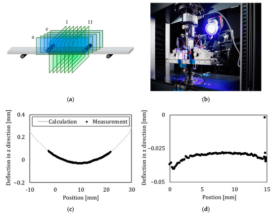 The deflection of the beam was extracted for different sections of the sample, as shown in Figure 4a. There are six sections in the beam direction (blue) and eleven sections between the inner force entry points (green).