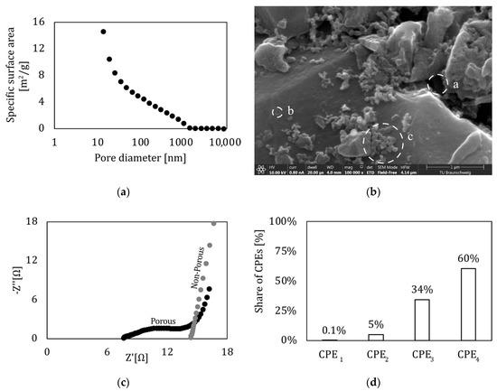 To analyze the surface structure of the electrode, three different techniques were used. The pore size distribution was investigated with the mercury porosimetry method, while the structure was analyzed with a scanning electron microscope (SEM). The last technique was electrochemical impedance spectroscopy (EIS) to obtain information on the electrochemical impedance of the sample. The results of the mercury porosimetry can be seen in Figure 5a. The electrode shows no specific surface area with pores that have a diameter above 1 µm. The share of the pore specific surface area starts increasing linearly at 1000 nm up to 20 nm, where it begins to increase rapidly. The highest specific surface is reached, with pores having a diameter of 10 nm and smaller. It must be mentioned that it is not possible to investigate pores with diameters smaller than 10 nm due to the machine’s restrictions.