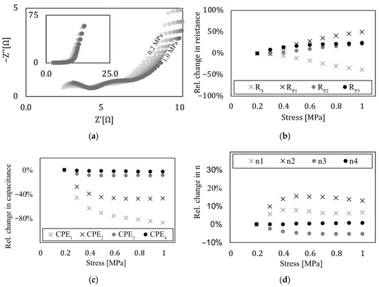 The change in mechanical pressure on those elements is more pronounced compared to CPE4’s influence in low frequency areas. Figure 6, c shows the changes in the CPEs for varying pressures. An increase in those elements up to 87% (CPE1), 47% (CPE2), and 9% (CPE3) can be observed. The same can be seen in Figure 6, a by the increasing waviness of the curves. The first two maxima correspond to CPE1 and CPE2. CPE3 influences the rising range in the low frequency range, while CPE4 can be seen on the reduced figure as mentioned before. Next is the change in the exponent of the CPE itself. In the case of n4, the mechanical load has no significant influence on the parameter; n1, n2, and n3, however, are influenced greatly by the load. The change in CPE, as well as the change in its exponent, both have in common that the characteristic of load influence is not linear. The graph seems to follow a function such as . Pressure influences not only the change in the CPE, but also the resistances. Rs becomes smaller with an increasing load, while R2–R4 behave in reverse (Figure 6b). This results in a shift in the curve’s maxima. The change in all resistances roughly follows a linear function.