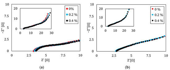 As described in Section 2.8, a four-point bending experiment with integrated supercapacitors was set up and investigated with EIS in different load scenarios. The result of one supercapacitor on the tension side (Figure 7a) and one on the compression side (Figure 7b) is shown here, as an example. The three load steps are visualized by colors, with red being the initial load free state, blue the state with a strain of 0.2% on the surface of the sample, and black the state with an outer fiber strain of 0.4%. Both plots show the high-frequency region, while the entire measured spectrum is plotted smaller in the corner of each diagram.