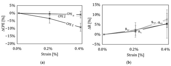 Naturally, there is a correlation between the mechanical load and the impedance spectra of the supercapacitor on the tension side, while the compression side seems nearly free of any mechanical influence (Figure 7b). On the tension side, there is a change in the whole spectrum which is investigated more deeply with the above-described ECM. To obtain a more general statement, the tension side of all six samples is investigated with the help of EIS and then analyzed by fitting the data to the ECM. Afterwards, the change in each element (E) in relation to its initial state (init) (Equation (9)) is calculated and, on that basis, the mean (Equation (9)) is determined.