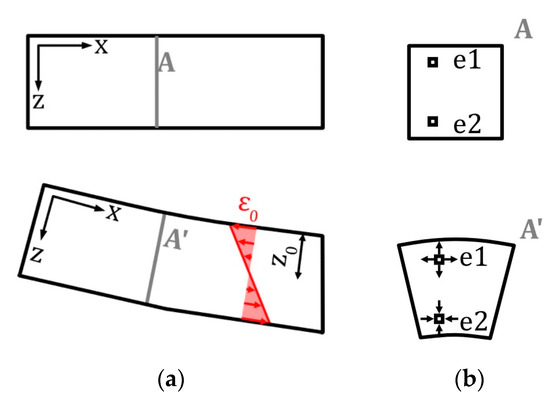Analytical analysis of a composite bending beam. Without load shown on the top and with load on the bottom (a). Stress distribution caused by the constant moment is visualized in red. (b) Sections of the bending beam showing two elements (e1 and e2) and their deformation.