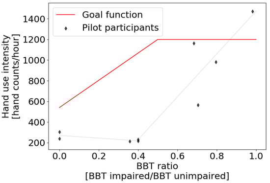 Hand count intensity goal function (red line) based on the BBT ratio between the impaired and unimpaired hands. The function was based on data acquired from pilot participants who wore the Manumeter during one day (diamonds). After the hand count intensity goal was defined, the daily goal was obtained by multiplying the intensity goal by the 10 h of expected daily wear time.